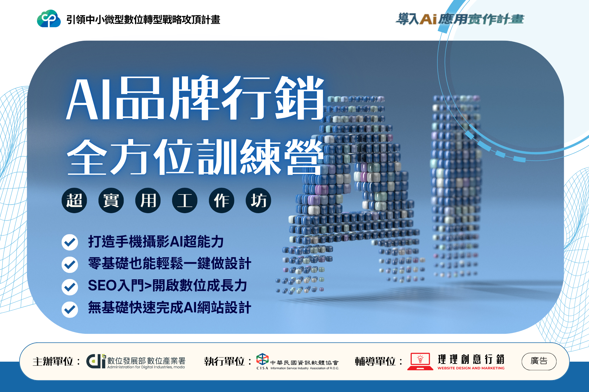 為協助中小微型企業及組織善用AI工具,提升數位營運與創新能量,數位發展部數位產業署推動「引領中小微型企業數位轉型戰略攻頂計畫—導入AI應用實作計畫」,本計畫由數位發展部數位產業署主辦,執行單位為:中華民國資訊軟體協會,並由理理創意行銷擔任輔導單位。